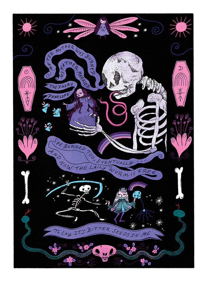 By the Sardine Queen, by salt and the devil, by blackwormy earth, and by the deep, dark sea, the catwitch Urfi conjures an angel to love her and have children with her. But angels aren’t meant for love, and with the embryonic egg of their unborn children, Urfi flees from her partner’s violence, enduring terrible trials to find a new and safe home in the faery forest.